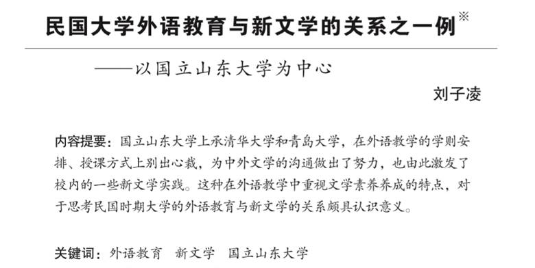论文认为,中国新文学自产生之日起,就与外国文学保持了密切的关系。国人接触域外文学潮流,留学并非唯一管道,新式教育产生的影响也相当重大。具体到高等教育层面,民国一些综合性大学的外国文学系和外语教学无疑也为学生们提供了研习外国文学的机会。国立山东大学的外文系和外语教育别具一格,尤其是其与新文学的关系,学界的了解尚不够全面,值得做一系统钩沉。论文指出,回顾中国近现代外语教育的历史,由偏重语言和翻译方面的技术训练,到“注重英美文学教育以培养学生的阅读和欣赏能力”,其间思路的转换之于新文学的意义,是一个值得深入考察的课题。山东大学的尝试,正是这种考察的必要组成部分。