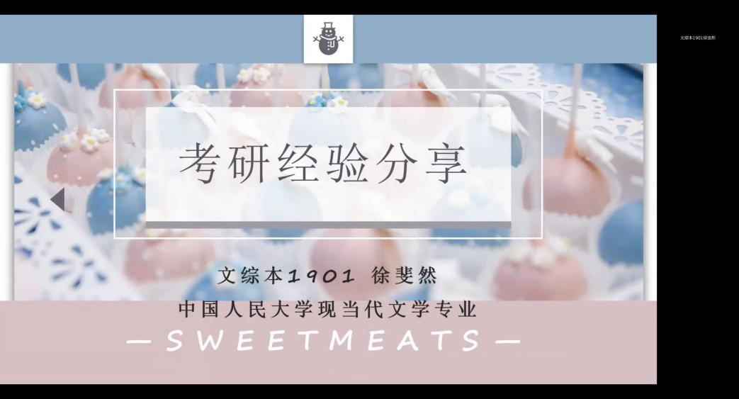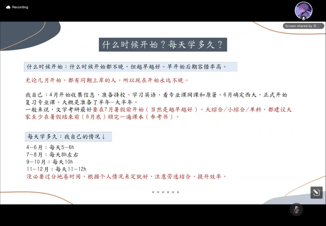 付一凡被推免到北京师范大学中国现当代文学专业,她具体介绍了推免条件、前期准备、院校及专业选择等注意事项,并与同学们分享了参加夏令营、预推免、九推三个阶段的经验,着重强调了推免过程中需要注意的细节。徐斐然以优异的初试成绩考研至中国人民大学中国现当代文学专业,她分享了自己的择校经验,详细介绍了备考过程中的时间安排和学习方法。