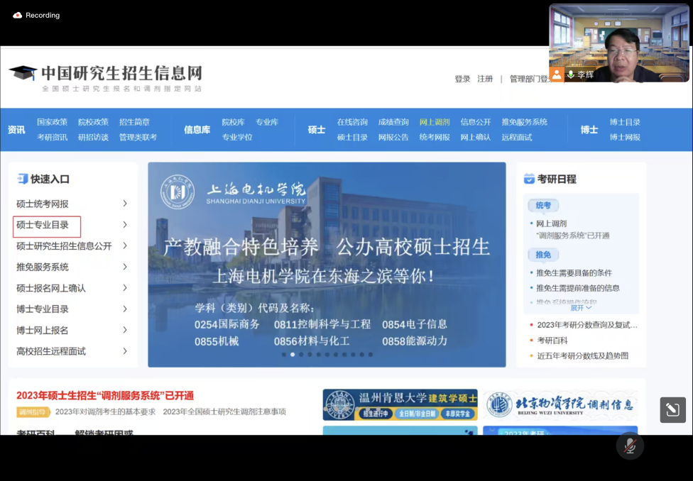 会议伊始,李辉从国家招生政策、考研分数线、专业报考及本专业考研情况等多个维度进行了整体介绍,详细分析了本专业所对应的相关高校及专业方向,针对考研选择问题进行了解读。