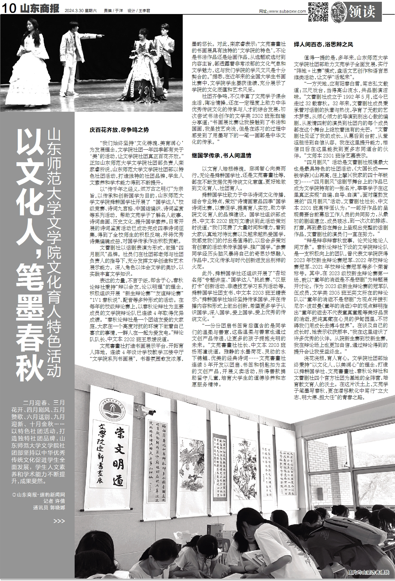 2024年3月30日《山东商报》整版报道了文学院文化育人特色活动,该文章由文学院师生共同完成。文学院始终坚持“文化铸魂、美育润心”的发展理念,全力构建育人平台,以特色社团活动,打造独树一帜的校园文化品牌,学生人文素养和学术能力得到不断提升。