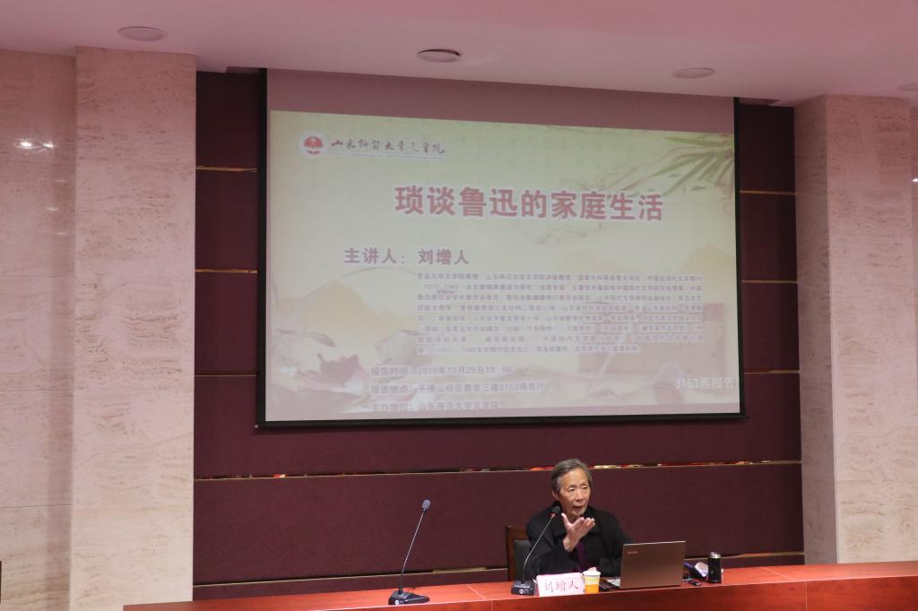 刘增人担任中国鲁迅研究会理事及《鲁迅全集》编辑委员会委员,在对鲁迅学术研究方面有颇深的造诣。他运用深厚的文学史料知识,多角度地向同学们介绍了一个生活化、血肉丰满及可亲可近的鲁迅。他围绕着夫妻、父子、母子、兄弟等关系从容地展开讲解,赢得了满堂喝彩。