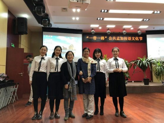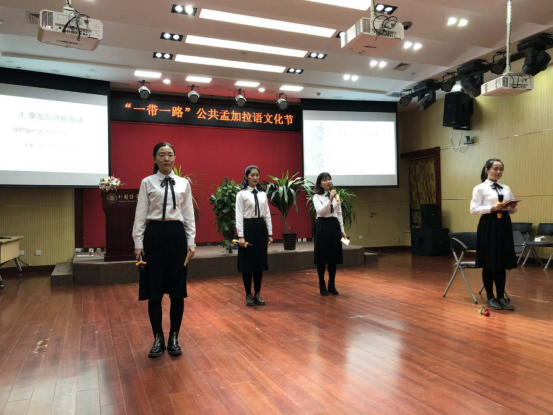 “这保证的洪流,一同泛滥于全世界!”文学院学子青春洋溢的声音穿过山东师范大学的校园,回响在冬日的燕园。2018年12月22日至23日,北京大学外国语学院亚非系联合中国社会科学院外国文学研究所“外国文学学术史研究工程”和山东师范大学文学院共同举办“从东方文学到亚非文学——学术史和学科建设专题”研讨会等系列活动。23日下午,我院2016级汉语言文学专业学生马芙盟、张瀚方、刘鑫、彭子茹创编的情景诗歌朗诵《生如夏花》作为研讨会的一个环节——“一带一路”公共孟加拉语文化节于北京大学外国语学院新楼501报告厅展演。