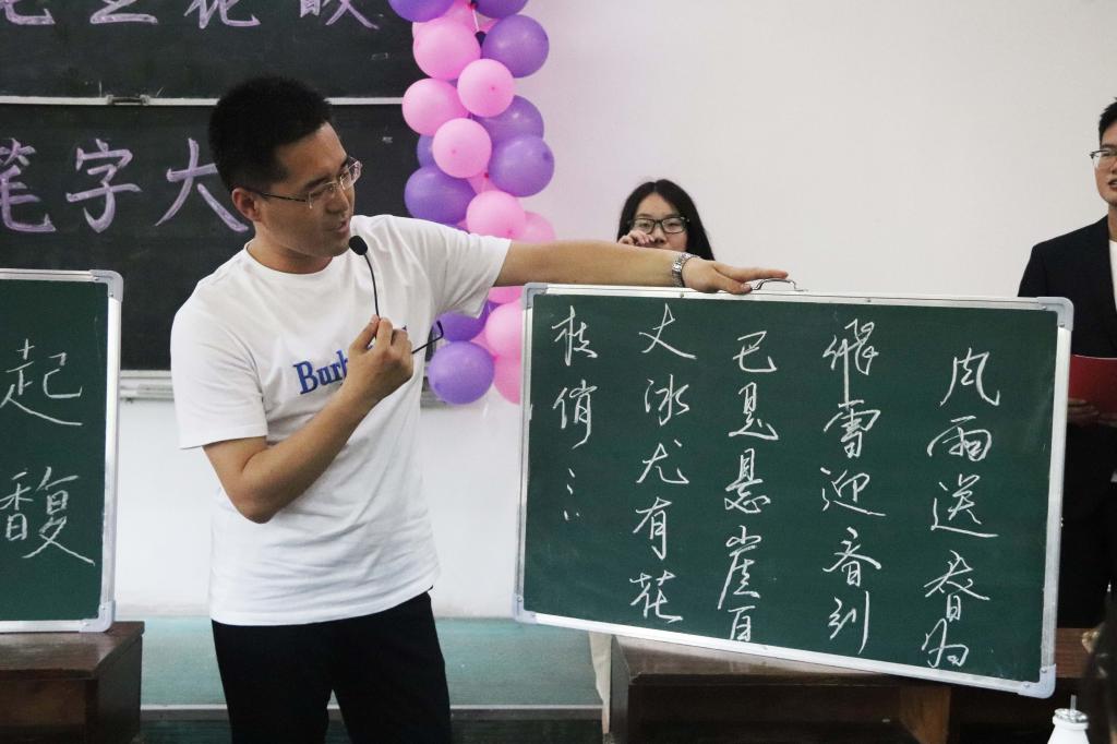 经过初赛的激烈角逐,每班最终各推选出一名选手参加决赛。比赛分为“挥毫泼墨,献礼五四”、“舞笔弄文,谁与争锋”、“妙笔生花,走进历史”三个环节,中间穿插两组演唱表演,内容丰富,异彩纷呈。选手们沉着冷静,写出的粉笔字或方正或圆润、或清秀或苍劲,赏心悦目,书写水平高超。在进行精彩的板书展示之后,形式多样的知识比拼又拉开帷幕:从《诗经》中的诗句对接到寻找图片中的李白杜牧,从“但愿长醉不愿醒”到“牧童遥指杏花村”,道道精心的题目设置为观众奉上了一场诗意盎然的文化盛宴。选手们认真思考,应答自如,其中六号张小烽更是连续答对三道题目,获得内容满分的佳绩。比赛进行到第三部分抢答环节时,现场气氛热烈活跃,选手们纷纷灵活思考快速作答争取得分,赵梓彤却始终保持冷静,从容稳定。她不慌不忙认真写好每一个字的态度赢得了观众们的阵阵掌声。最后,评委根据选手们的综合表现进行评选,文师本1701班李津铭和文综本1801班刘蕾凭借扎实的板书功底和丰厚的知识储备获得一等奖;张淑敏、孙喆、张小烽、赵梓彤获得二等奖;张桂云、卢裕宁、陈一满、孙念桐获三等奖;李璐、刘闰之等十二名同学也获得了优秀奖。