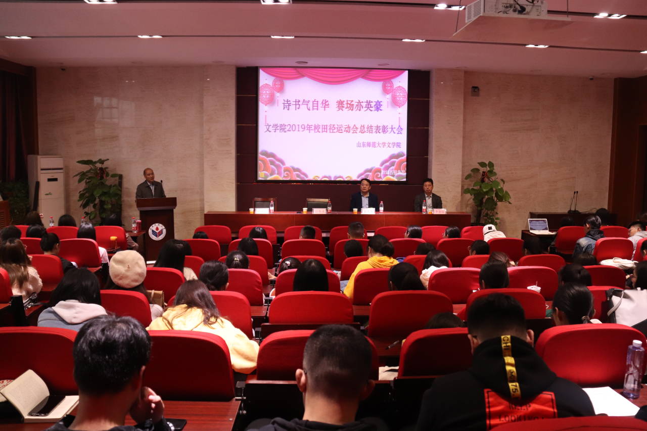 10月31日中午,文学院于千佛山校区教学三楼3153报告厅成功举办2019年校田径运动会总结表彰大会。大会由文学院党委副书记刘兆波主持,文学院党委书记肖光军、院长孙书文、团委书记李金波及各年级辅导员出席大会,文学院运动员及部分2018级、2019级同学到场。