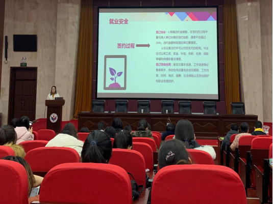 会议进入第二环节,由孙爽老师以“毕业亦是开始,待与青春长久斗”为题,围绕签约流程、派遣方式、就业安全、温馨提示四个方面对毕业生展开了就业指导。首先,她以师范类毕业生签约网站——山东省教育厅高校毕业生就业网为例,向同学们展示了具体的签约流程;接着,她针对劳动合同、灵活就业等派遣方式做了详细说明;随后,她细心提醒同学们须关注就业安全,尤其注意以口头合同、抵押合同为首的需要慎签的合同;最后,孙爽老师对就业推荐表、“应届毕业生”身份认定、档案查询等方面进行了温馨提示。会议在热烈的掌声中圆满落幕。