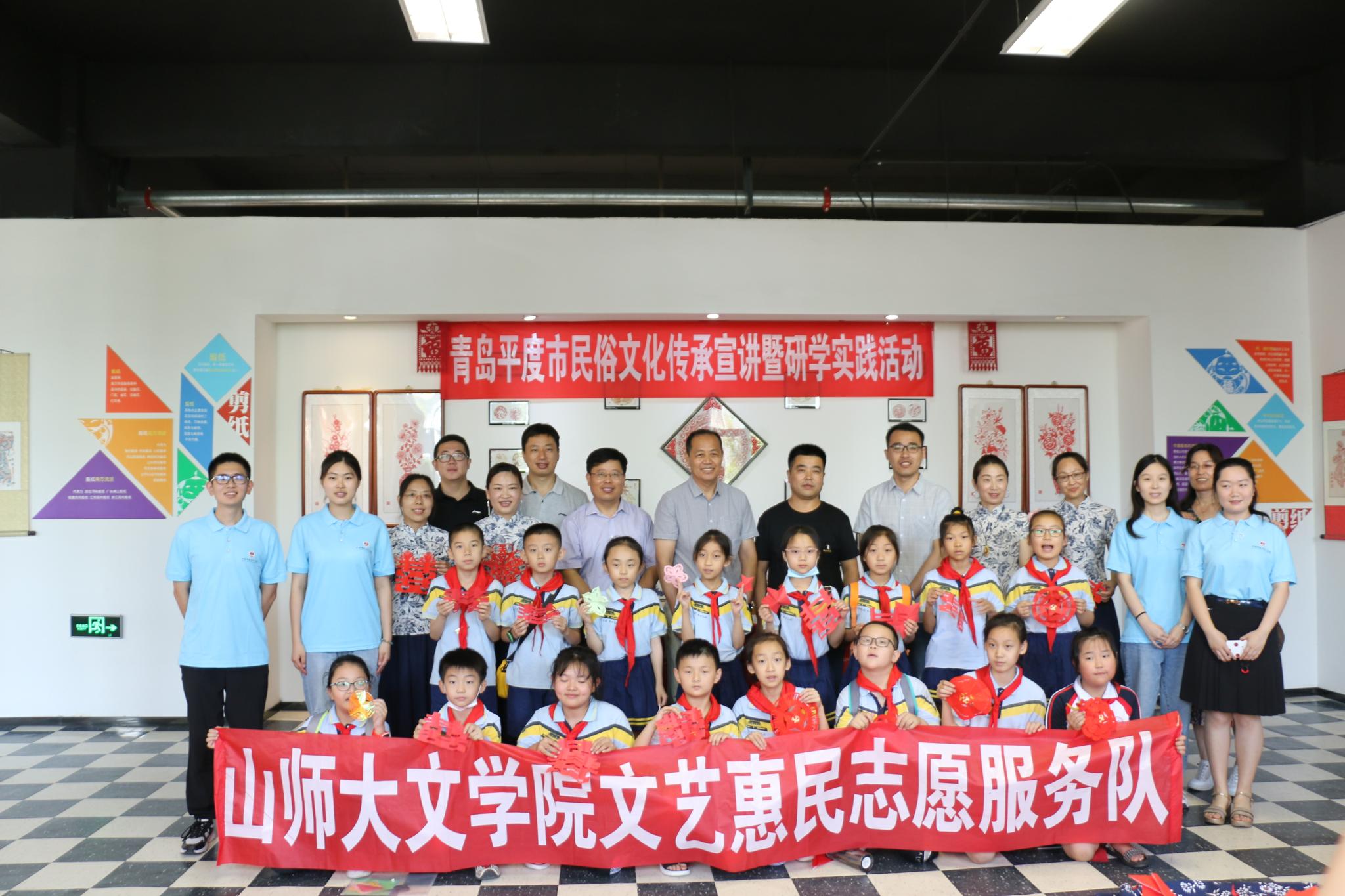 7月18日,实践队一行又来到了青岛蓝树谷青少年世博园民俗馆,开展青岛平度市民俗文化传承宣讲暨研学实践活动,来自平度各地的艺术家代表和中小学生代表约50余人一起参加了本次活动。民俗馆剪纸室中,实践队队长李盛菲就民俗非遗文化概况和民俗非遗文化传承的重要意义进行了宣讲。平度市民间艺术家协会主席高杰,民俗剪纸艺术家郑峰雷、姜晓莲、许笑艳、葛维平等现场指导实践队成员及小学生们实践剪纸,大家神情专注,沉浸在剪纸艺术的美妙世界中。随后,实践队相继参观了年画厅、风筝厅、草编厅、泥塑厅、贝壳厅、纺织厅等多个民俗展厅。为进一步加深研学实践,体验完民俗馆后,大家又参观体验了地震馆、科技馆等两个场馆,圆满完成了此次文化探寻和研学之旅。活动结束后,山师大文学院党委刘书记和团委书记李书记及辅导员老师结合小队近来的活动实践对小队组织工作及实践设计给予了高度评价和赞扬,同时也为小队未来的工作导向指明了方向。山东师范大学暑期“三下乡”的实践队成员们也分别向李书记、刘书记、张建老师和张海洋老师汇报了自己在实践中的感悟和体会,并一致表示一定会不断优化实践内容,积累自身经验,展现山师学子的风采。