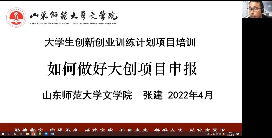 为帮助同学们深入了解创新创业,进一步做好大创立项工作,4月12日晚,文学院举办大学生创新创业训练计划项目培训暨大创申报动员会,动员会以腾讯会议的方式线上进行。文学院2019级辅导员张建担任主讲人,八十余位同学线上参会。