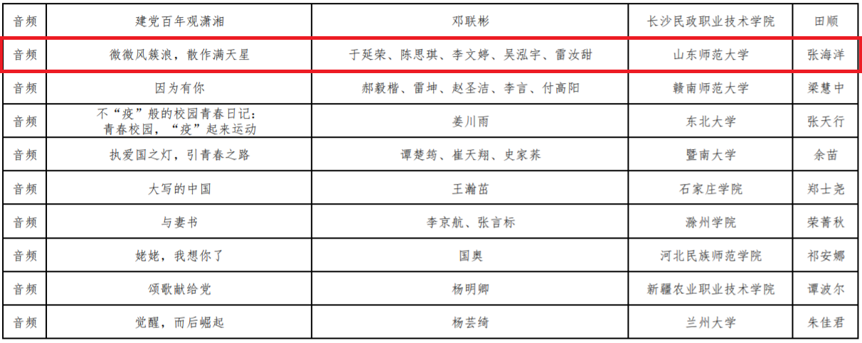 3月16日,教育部公布了第六届“全国大学生网络文化节”和“全国高校网络教育优秀作品推选展示活动”的评选结果。文学院由2020级辅导员张海洋指导,于延荣、陈思琪、李文婷、吴泓宇、雷汝甜同学创作的《微微风簇浪,散作满天星》在“全国大学生网络文化节”中获得音频类作品优秀奖。