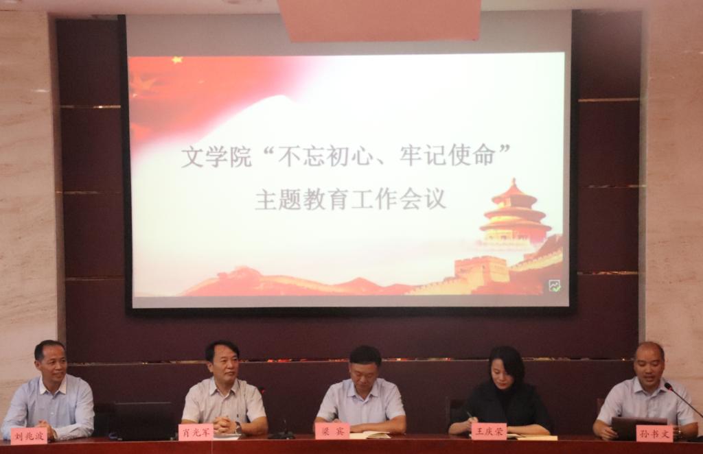 根据会议安排,学院党委书记肖光军首先传达了学校党委关于开展“不忘初心、牢记使命”主题教育的通知精神,对文学院开展主题教育作出动员部署。他从“提高政治站位,充分认识主题教育的重大意义”“聚焦目标要求,推动主题教育扎实有效开展”“加强组织保障,保质保量完成各项目标任务”三个方面对主题教育作出安排、提出要求。他强调,文学院当前正处于迎接教育部第五轮学科评估的最后冲刺阶段和推进落实新一届班子任期目标的起势阶段,全院党员干部应该提高政治站位,强化思想认识,联系工作实际,认认真真参与主题教育,坚持两手抓两促进,用实际行动和教育成果推动学校和学院各项事业实现高质量发展。