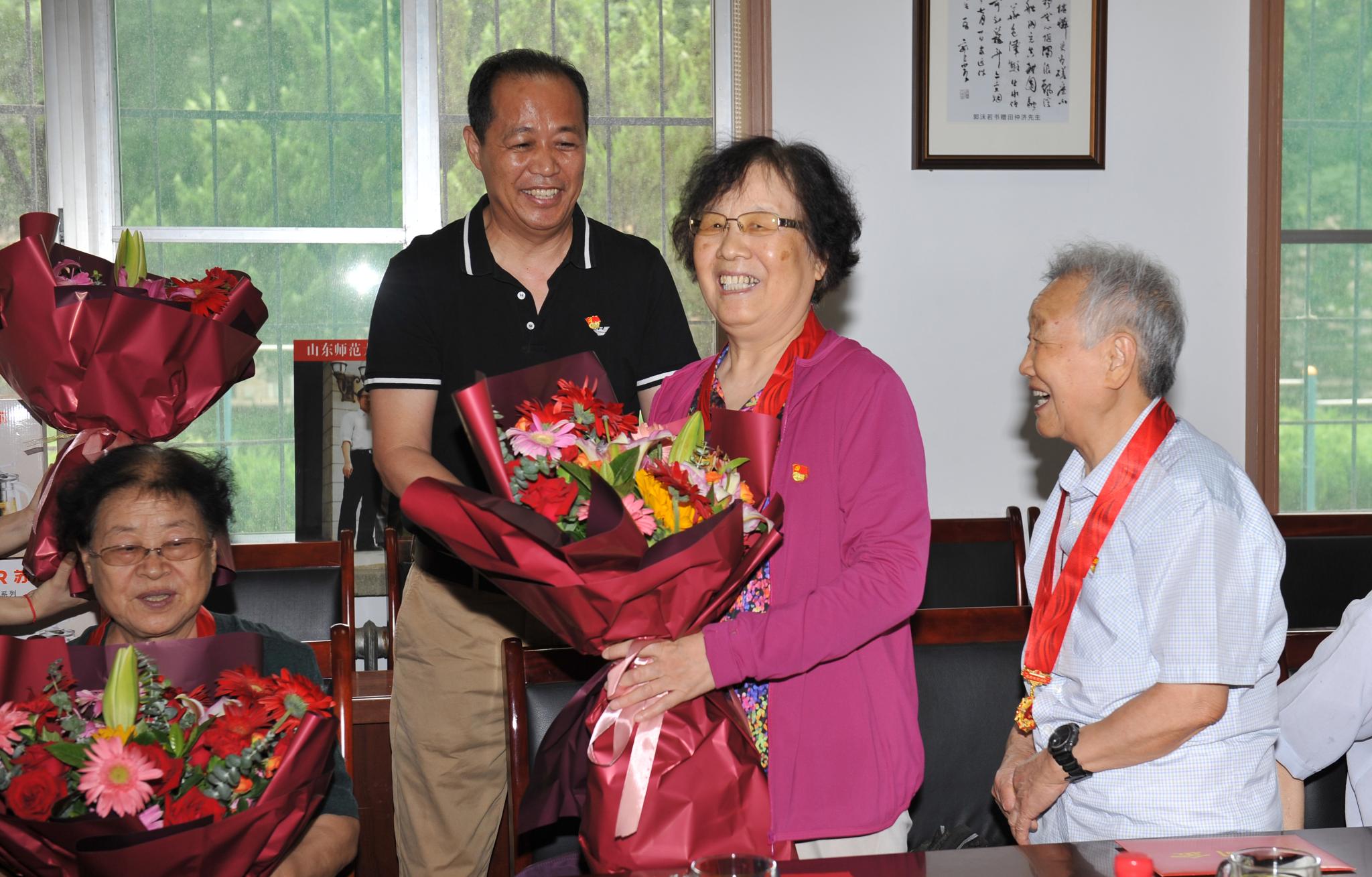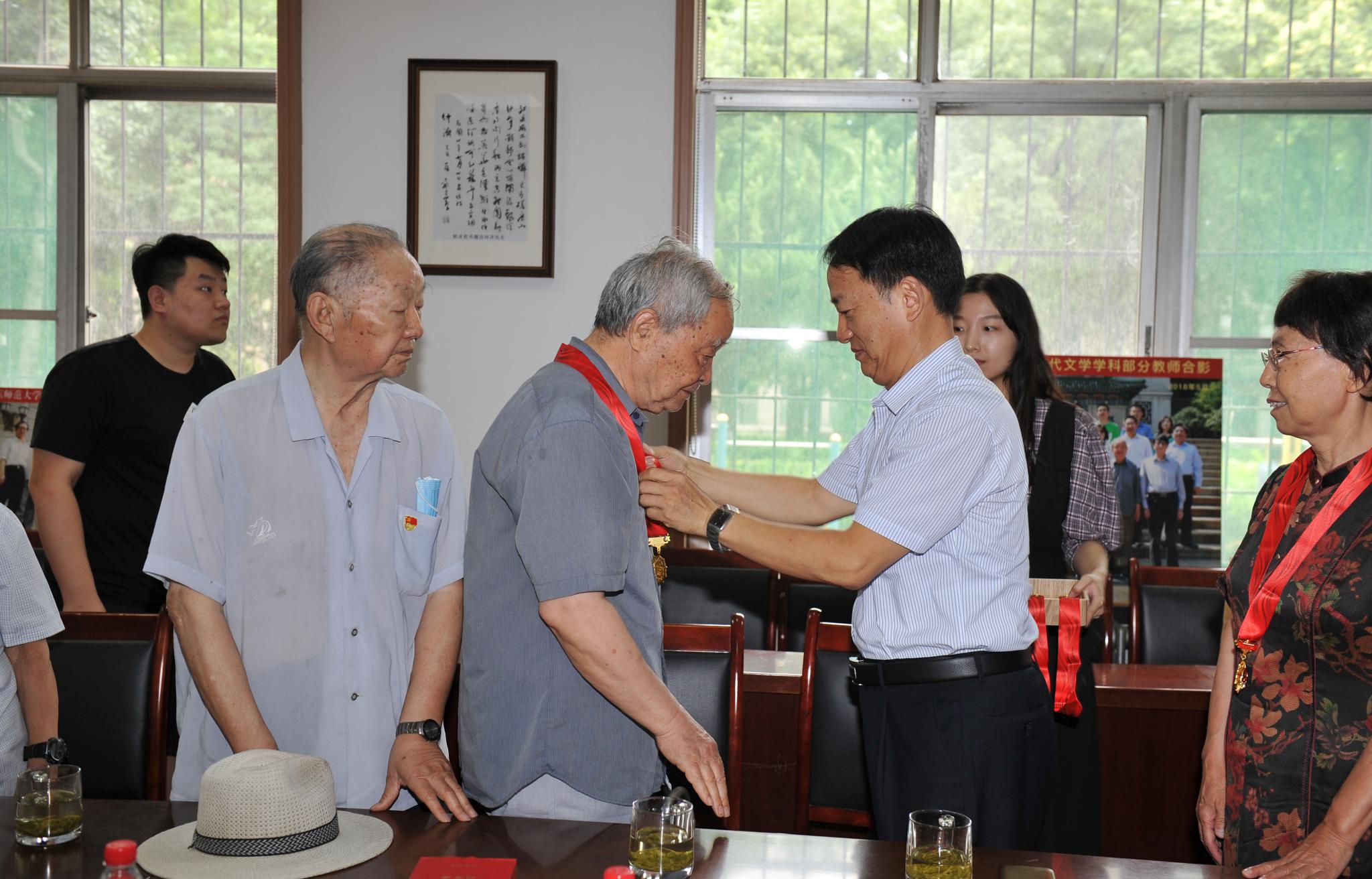 接下来,在文学院原党总支书记李宗玮的带领下,全体参会人员重温了入党誓词。随后,在庄严的音乐声中,肖光军为7位老党员一一颁发了“光荣在党50年”纪念章,孙书文、刘兆波为老党员们献上了鲜花、慰问金和慰问品,表达了对老党员长期以来为党的教育事业付出的艰辛努力和无私奉献精神的肯定和敬佩。