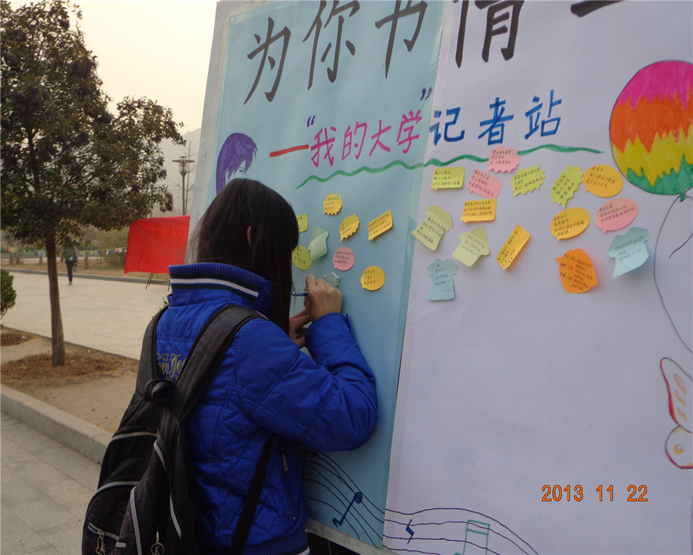 为给同学们搭建一个展现自我的平台,激发同学们内心深处最真实的情感。文学院于11月21日在天颐广场举行“三行情书”征集活动。本次活动还在人人校园网上同步开展,得到了同学们的热烈支持。