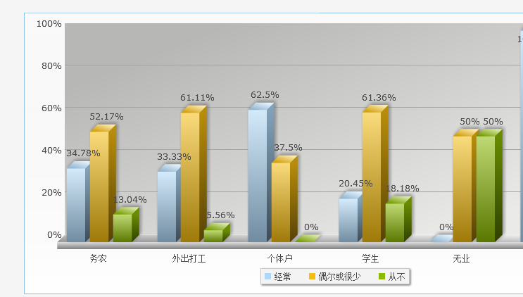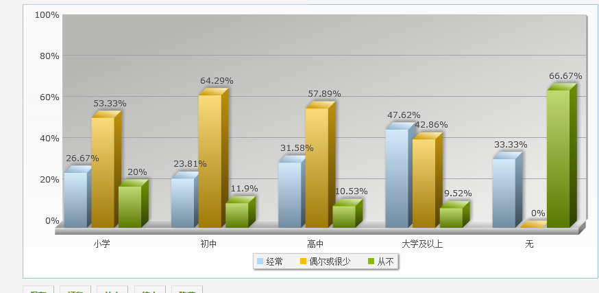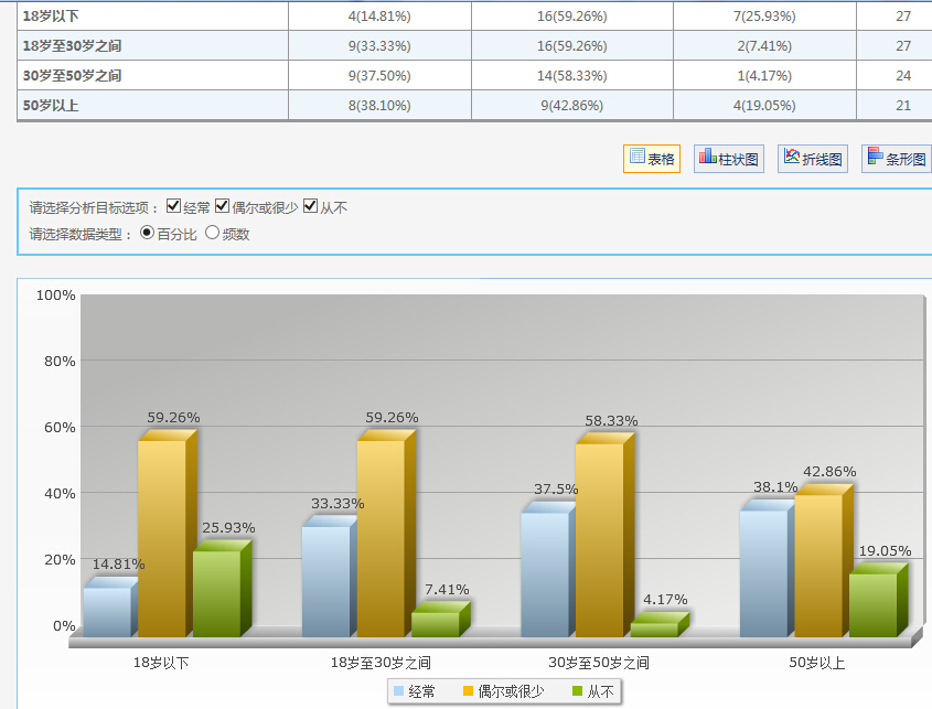 我们的问卷中设置了一系列相关问题,然后根据答案选择的人数进行相应的数据分析总结,最后得出相应的结论。具体问题和统计结果如下: